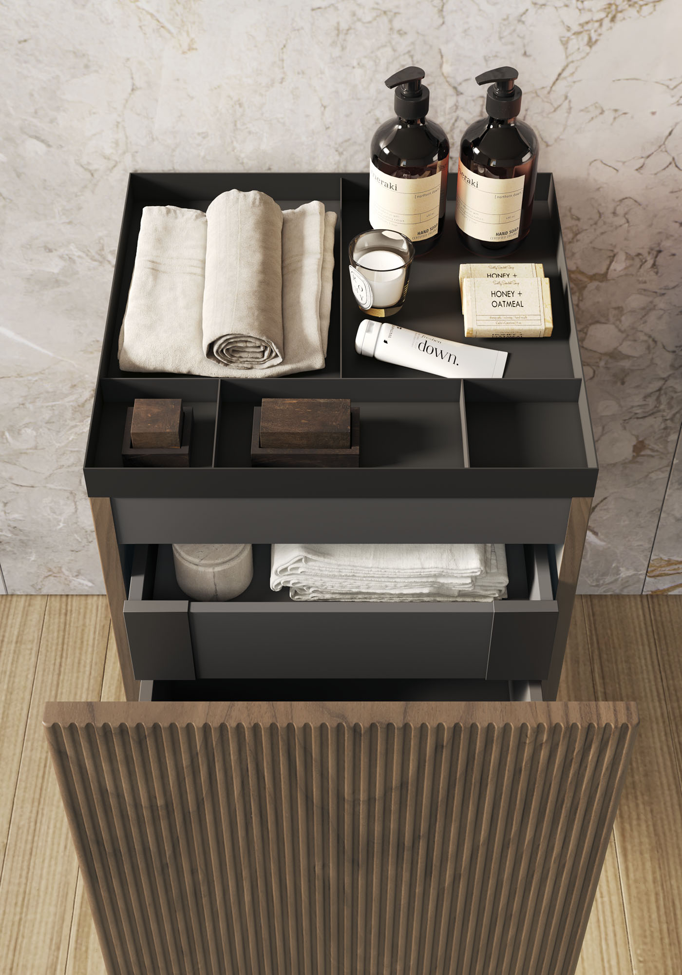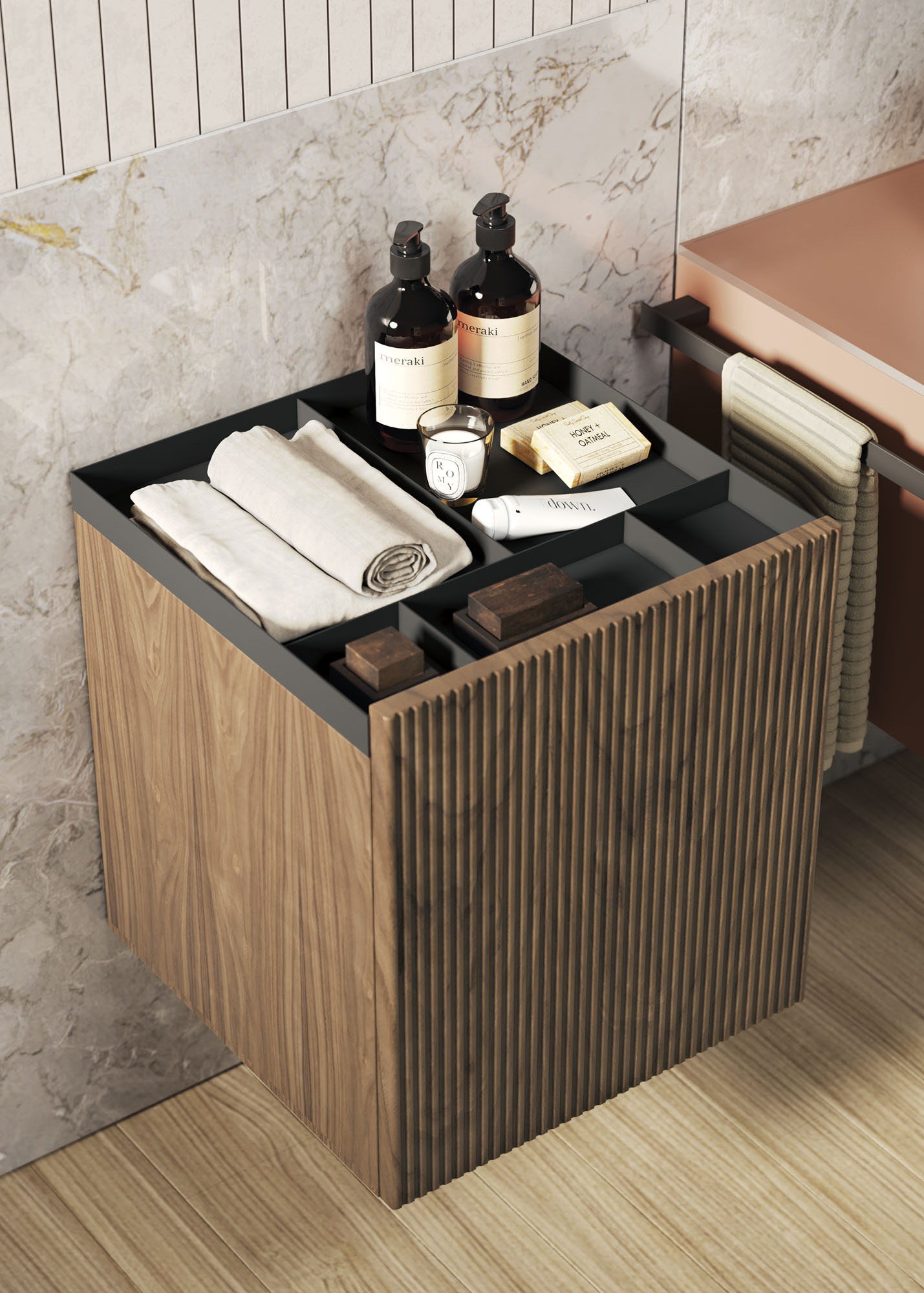 CP5004 Base LIDIA CANNETTATA L.45 H.50 P.46 noce gold con cassetta portaoggetti metallo nero opaco